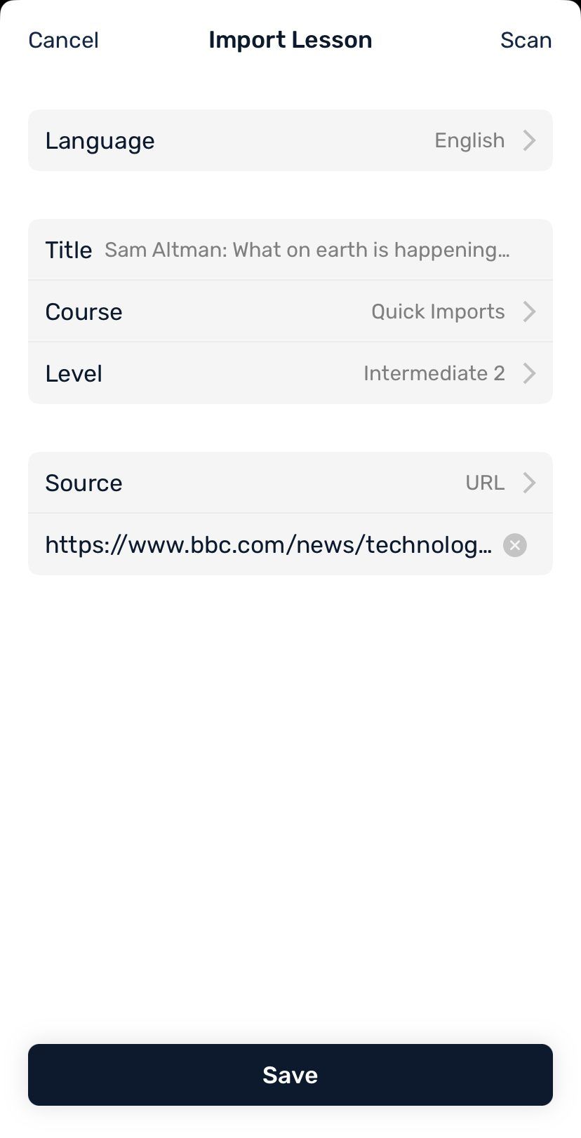 1. Find the URL or copy the text of the content you would like to create a lesson with. Click the Import icon in the bottom right of the Library screen on iOS and Android and the top right of the Library screen on the web.