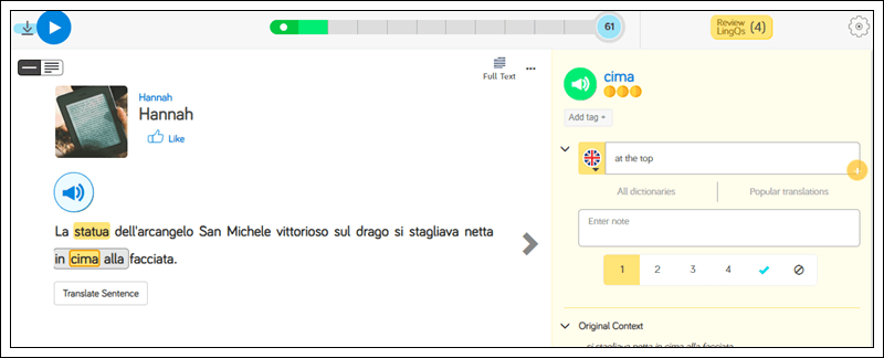 There are some very cool features in LingQ, including sentence mode which allows you to translate the entire sentence with ease.