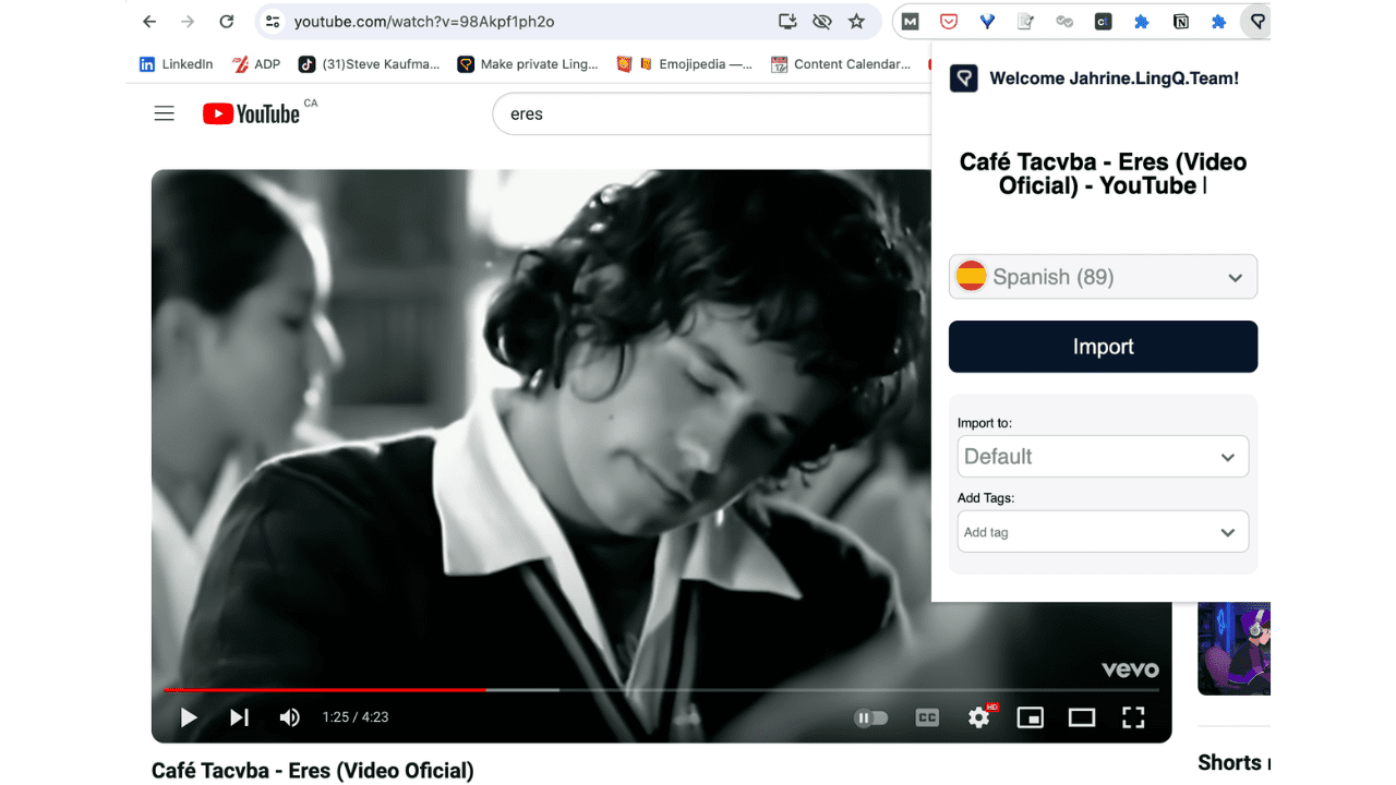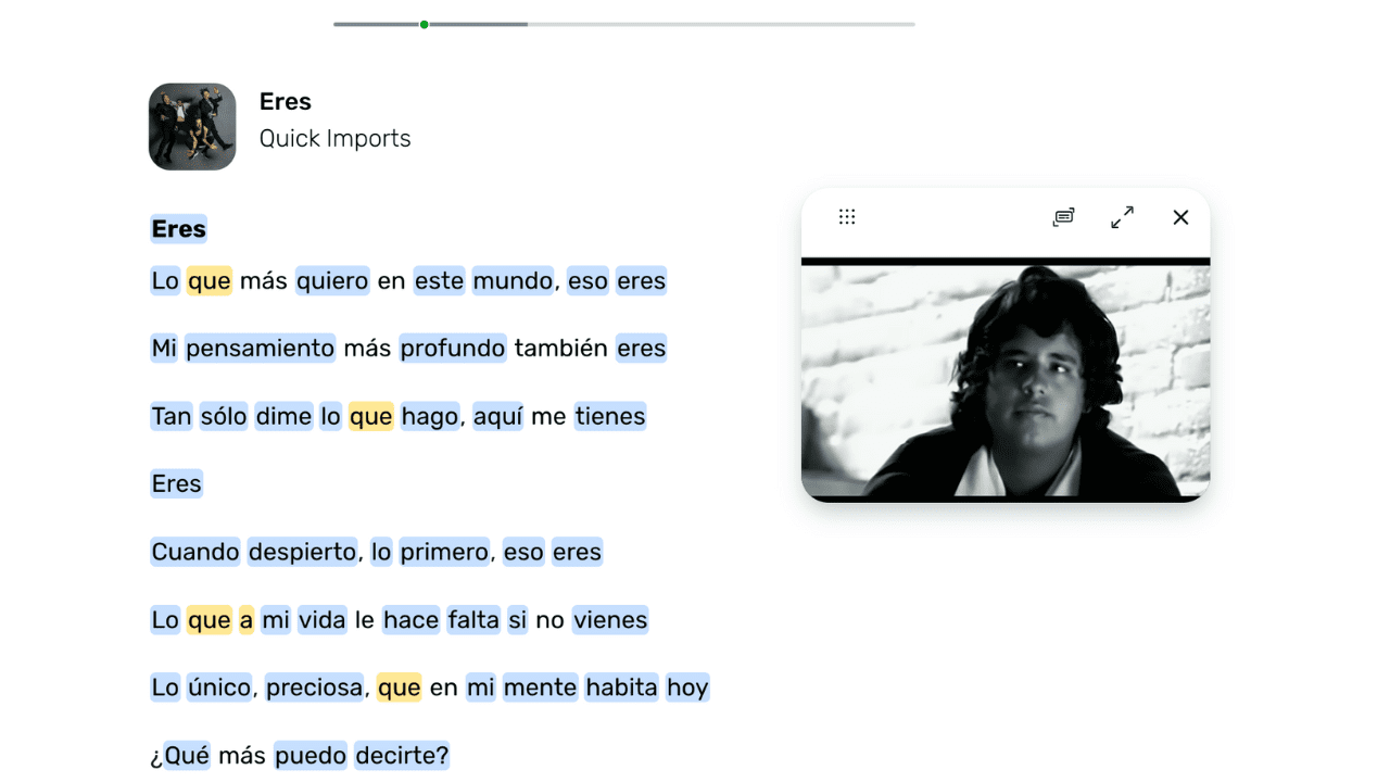 The song is about being in love, and not wanting to be without that certain someone. It is a little above my beginner level and maybe a little cheesy, but I believe it’s good for learning Spanish. So good in fact that I uploaded it to LingQ as a lesson using the LingQ Importer browser extension (available for Chrome, Safari, Edge and Firefox).
